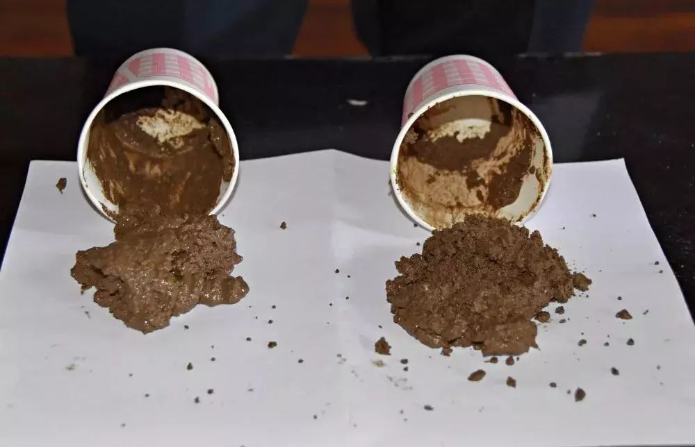 用“松土”产品(右)的土壤倒扣出后,水分渗出少,无流散。